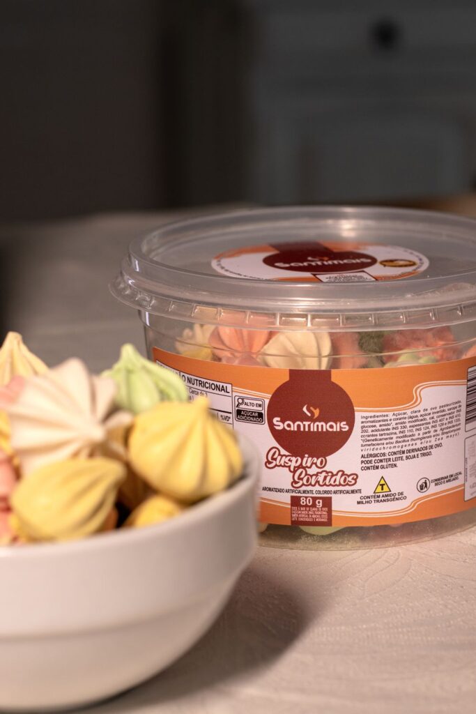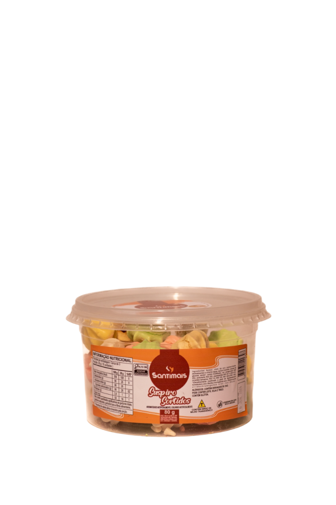 Açúcar, clara de ovo pasteurizada, aromatizantes e corante (água, açúcar invertido, xarope de glucose, amido*, amido modificado, sal, conservador INS 202, acidulante INS 330, espessantes INS 407 e INS 410, corantes tartrazina, INS 110, INS 124, INS 129 e INS 133). *(Geneticamente modificado a partir de Agrobacterium tumefaciens e/ou Bacillus thuringiensis e/ou Streptomyces viridochromogenes e/ou Zea mays).